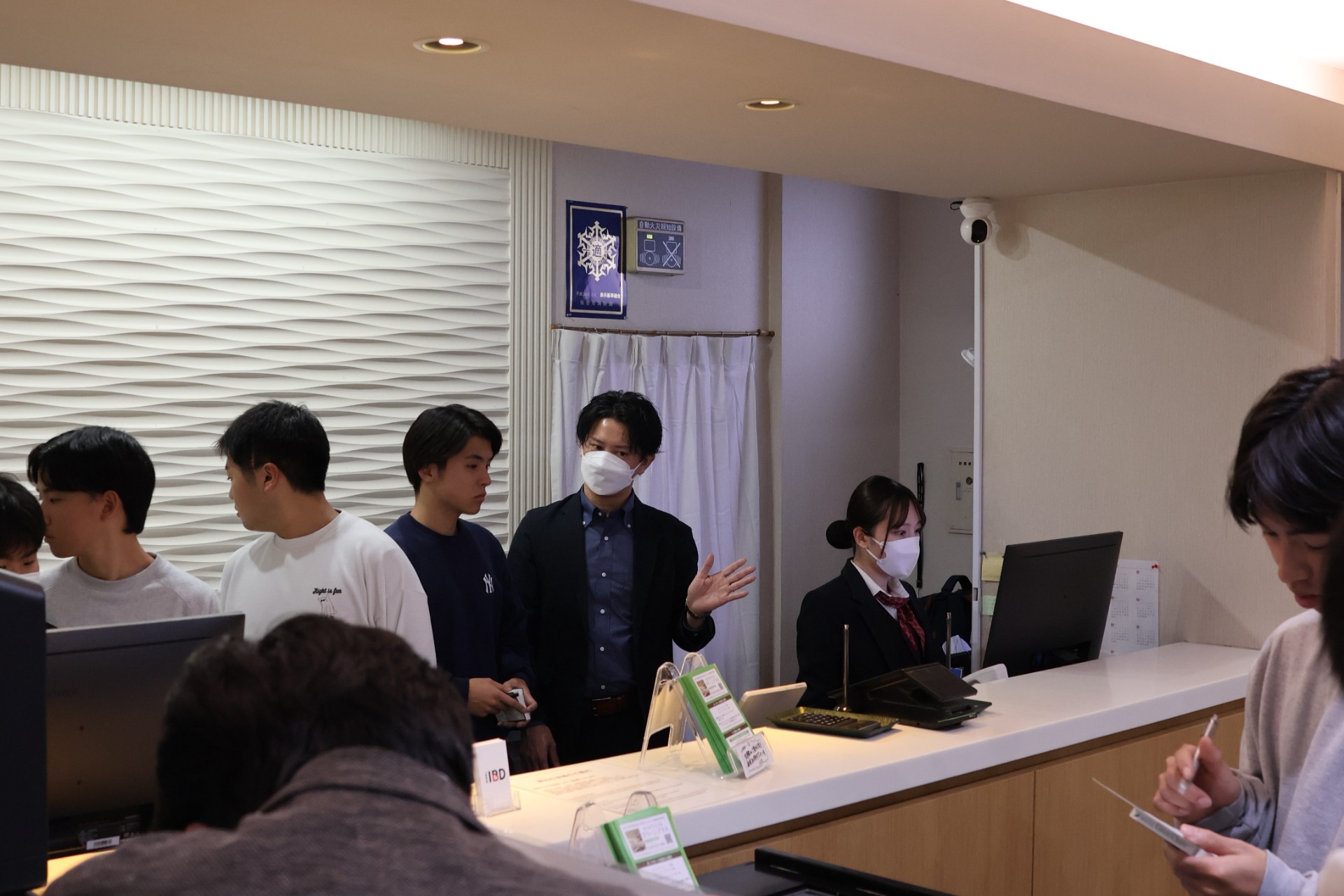フロント業務を見学する高校生と説明する人事担当者